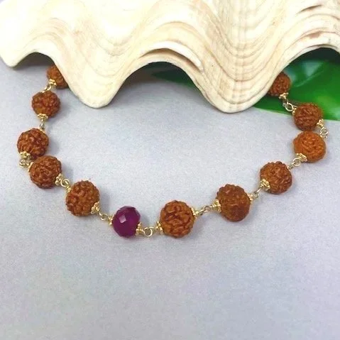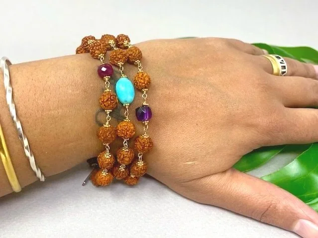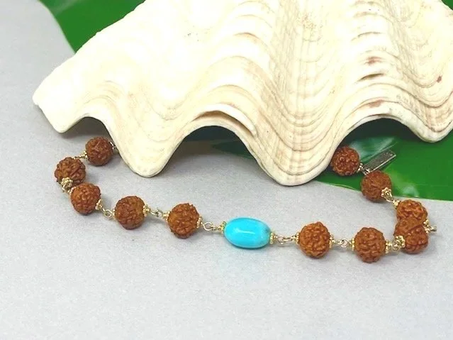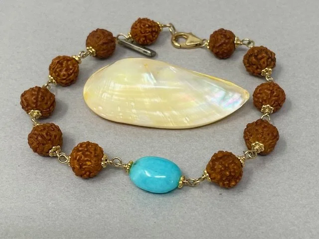 This whimsical bracelet features 12 rudraksha beads and a 7mm faceted amethyst cube all capped with 22k gold plate daisy beads and linked together with 14k gold filled wire. This bracelet is joined together with a 14k gold filled lobster clasp and carries the iconic H*MC logo tag in sterling silver.