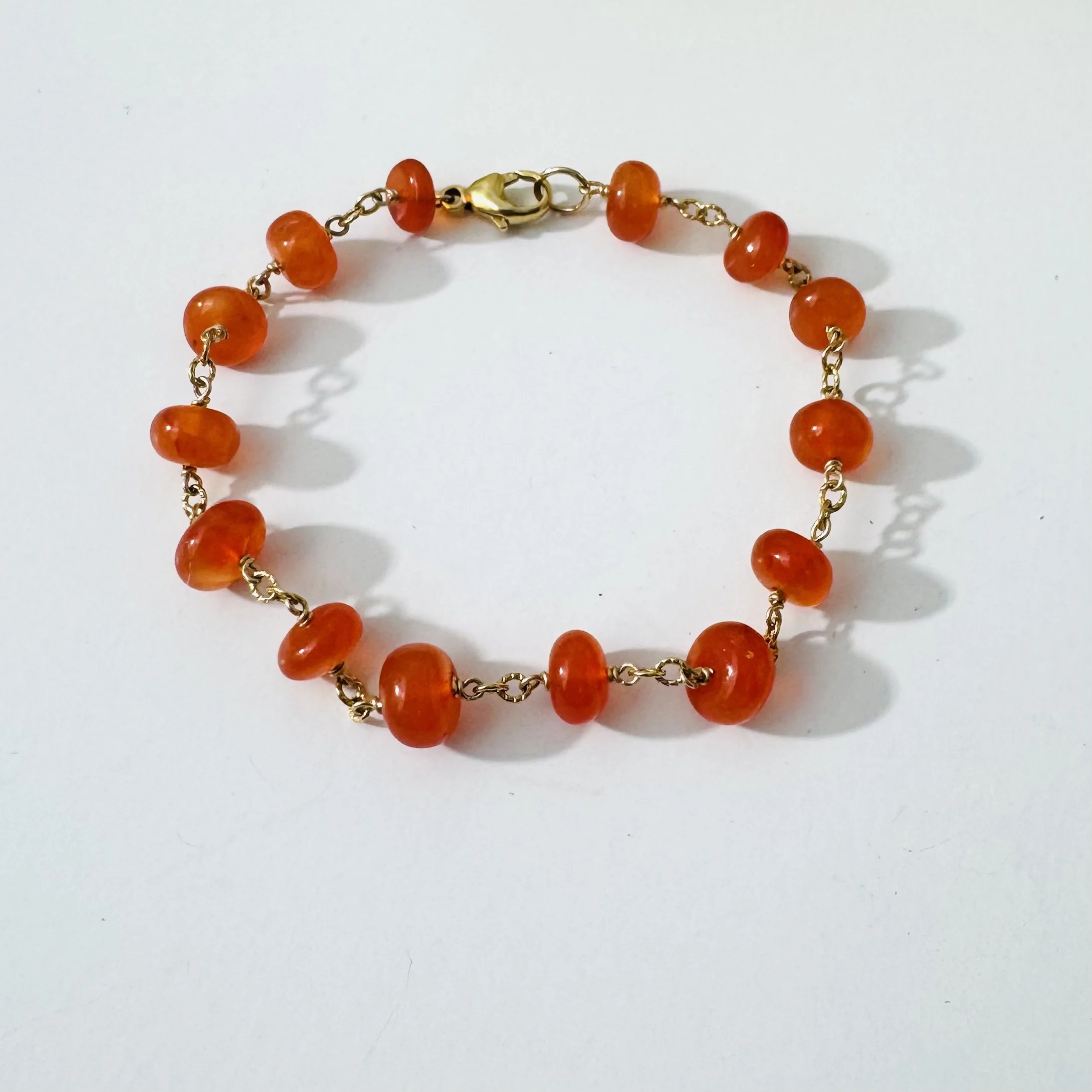 For those who love color, this bracelet will be your new favorite. This bracelet consists of 14, 7 mm smooth carnelian rondelles. All linked together with 14K gold fill chain. With a strong and simple gold fill lobster claw this bracelet measures at 8 inches. Item#HMCB5596873