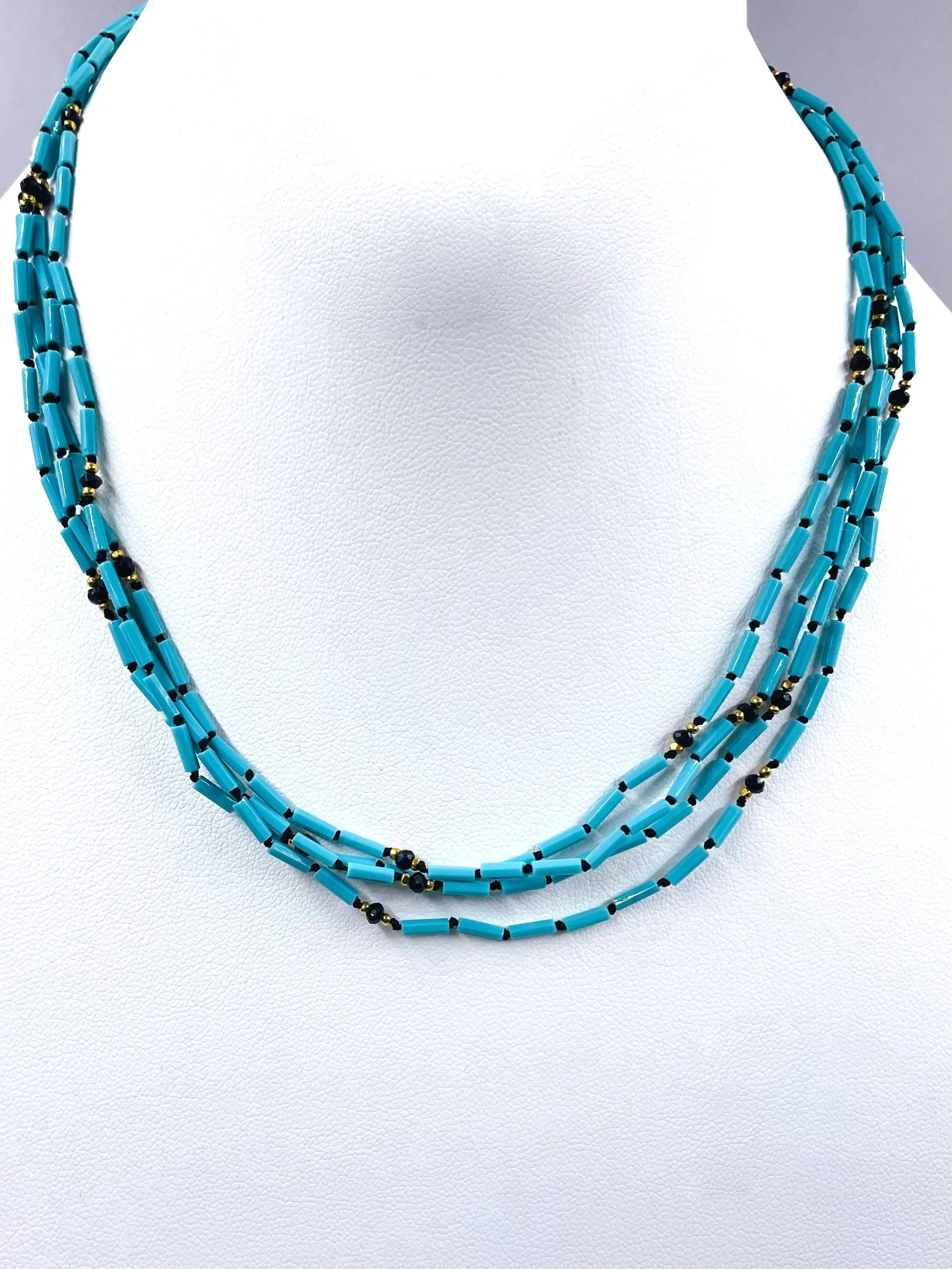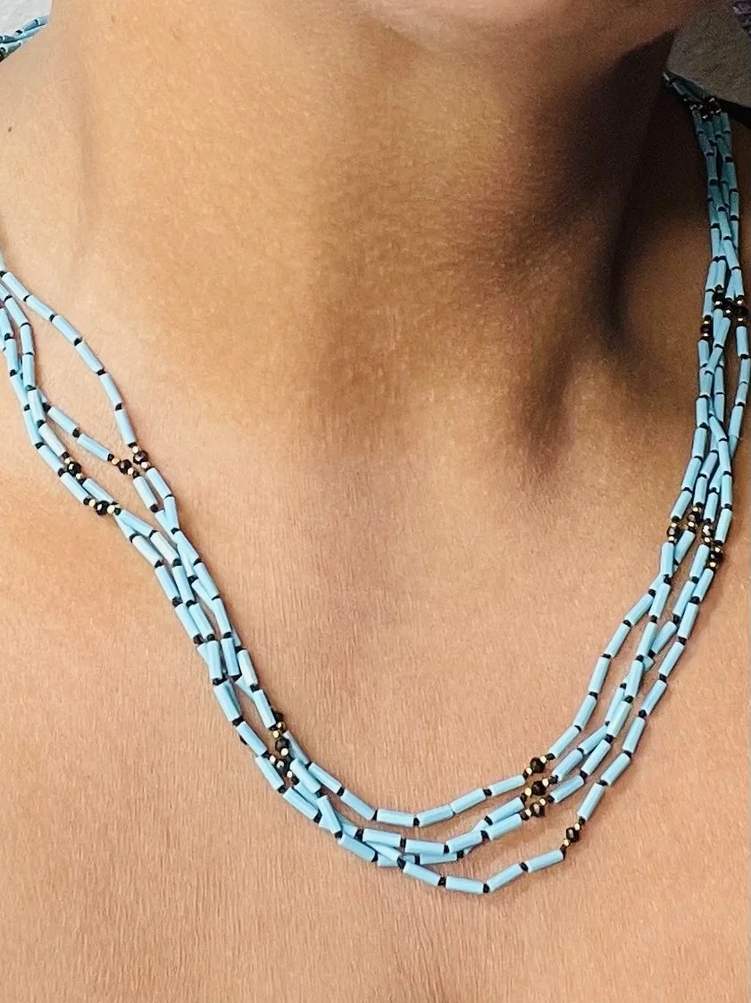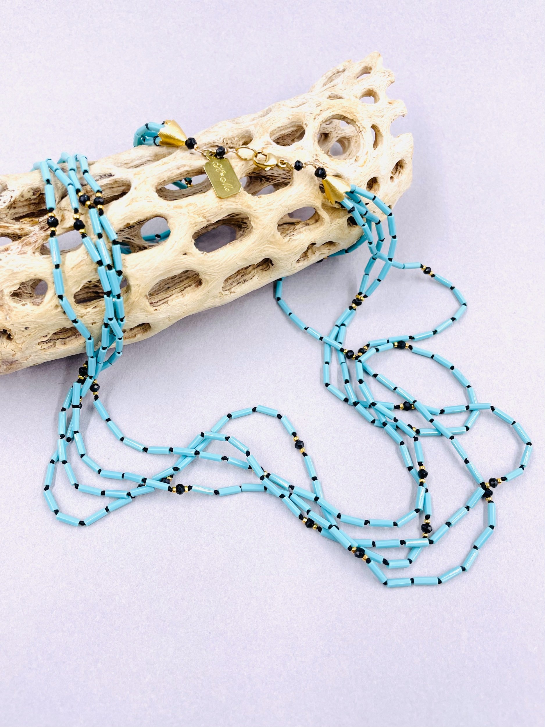 Make a statement without saying a word. This stunning multi strand necklace consists of four hand knotted strands of turquoise Czech glass beads with sprinkles of black spinel, and 22 karat gold glass charlottes dispersed throughout. All brought together with a sturdy and stylish 14K gold fill lobster claw clasp and is 22 inches long.
